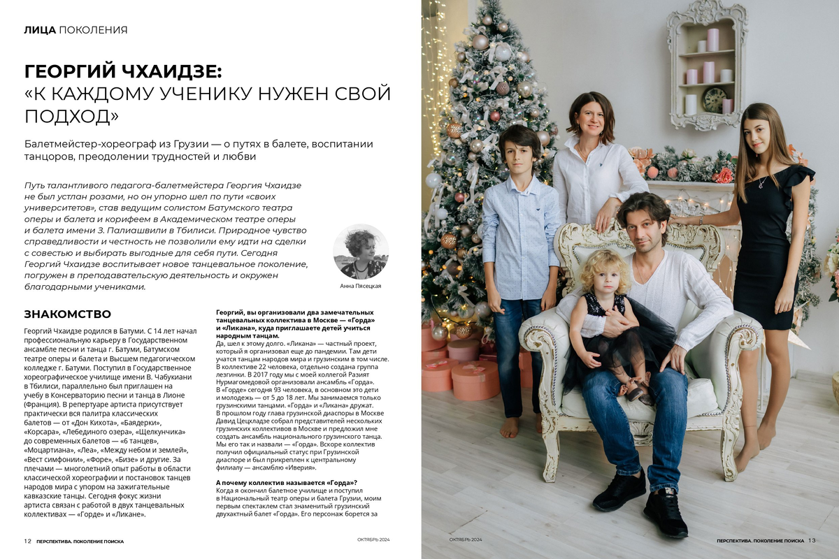 В октябрьском номере журнала "Перспектива. Поколение поиска" вышло мое интервью с замечательным балетмейстером из Грузии Георгием Чхаидзе. Познакомилась я с ним через талантливую актрису и художницу Нану Татишвили, сын которой ходит танцевать грузинские танцы в ансамбль "Горда" при грузинской диаспоре, которым и руководит Георгий. До своего "московского периода", он был солистом и корифеем нескольких театров в Грузии и Франции. Его жизнь полна ярких моментов. Об этом мы поговорили в интервью.