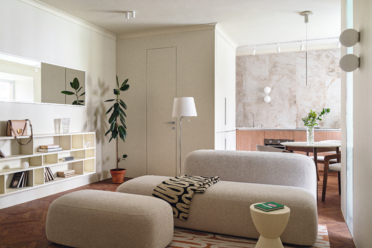 Следуя пожеланиям заказчиков — молодой пары, которая любит путешествовать, дизайнер Марьям Разуваева создала интерьер вне моды, мягкий и монохромный. Реализованный проект превратился в пространство, где случаются лучшие вечера и самые вкусные завтраки. Как история начинается с чистого листа, так и наш проект стартовал с демонтажа старого ремонта и полного обнуления. Молодая пара приобрела квартиру как инвест-объект с заделом на продажу или краткосрочную аренду. Большое внимание мы уделили планировочному решению и сами себе поставили задачу избавиться от коридора площадью 11 кв. м. Результат превзошел все ожидания: нам удалось разместить в квартире все необходимое — кухню-гостиную, гардеробную с постирочной, гостевой санузел, кабинет (в будущем — детскую) и мастер-спальню с санузлом. Перед нами стояла задача отделить приватное пространство для отдыха хозяев от общего: мы выделили место для двух санузлов, обеспечив тем самым автономность и независимость этих зон друг от друга. Квартира