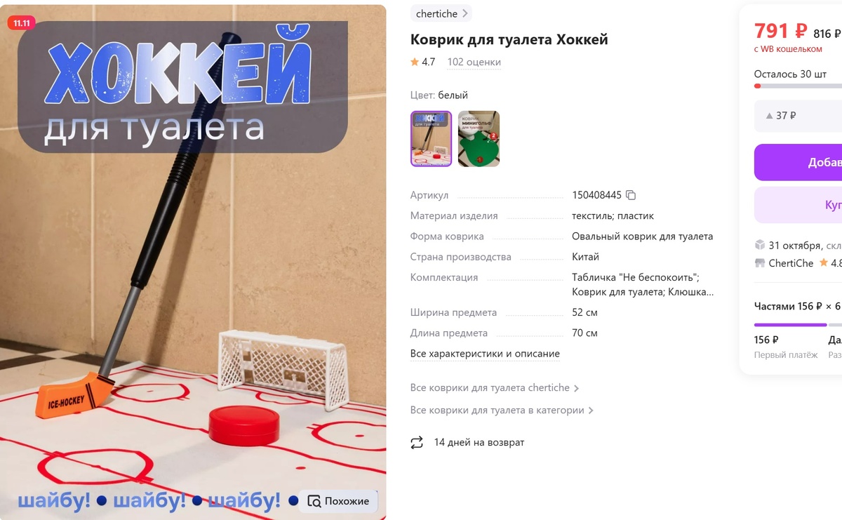 В последнее время как-то так сложилось, что несколько раз за небольшой период времени бороздила сайт Вайлдберрис, искала и заказывала то, что мне было нужно. А попутно натыкалась на предложение таких товаров, что просто терялась в догадках: зачем это продают и кто такое покупает. Оказывается да, и продается, и покупается, да еще и отзывы покупатели пишут, и вопросы задают. Сейчас расскажу о нескольких товарах, которые поразили меня в самое... нет, не сердце. Даже не знаю куда, но точно поразили. Это такой коврик около унитаза, рисунок как на хоккейном поле, есть ворота, в комплекте клюшка и шайба. Вот садитесь вы на унитаз с вполне земной целью и начинаете гонять шайбу по коврику. Здорово? Честно признаюсь, я не знаю, здорово или нет. Не покупала и не пробовала. Но в статистике этой страницы покупатели есть, целых 102 человека. А не нравится хоккей, можно в гольф поиграть, не слезая с унитаза. Смотрите, как увлекательно описывают это производители. И правда ведь гольф увлекательнее