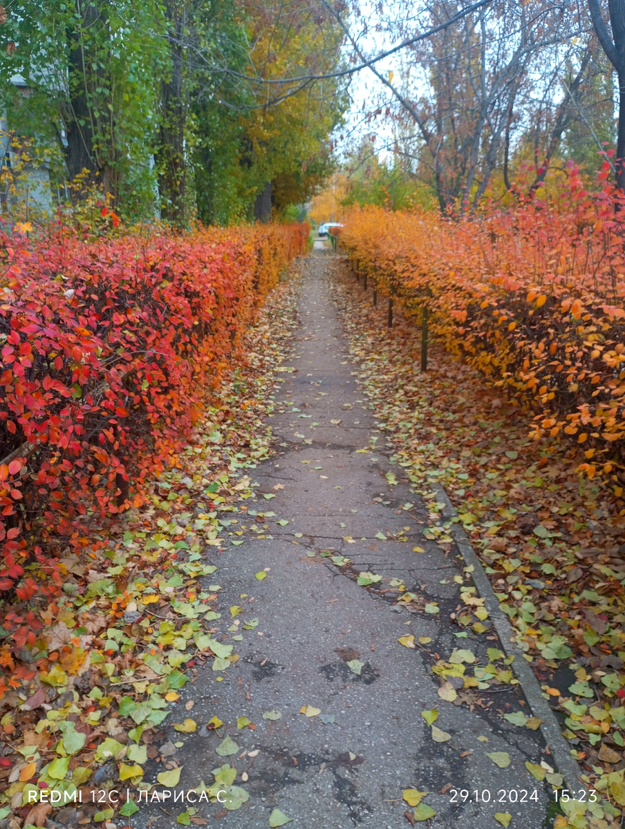Это Лариса С. Приветствую дорогих подписчиков! Осенняя погода в этом году долго радует тольяттинцев. 🍁 У нас просто шикарно на улице! Если бы у меня дома никаких дел не было, я бы гуляла до вечера и наслаждалась дарами матушки природы нам, своим деткам землянам. "Земля в иллюминаторе, Земля в иллюминаторе, Земля в иллюминаторе видна.. Как сын грустит о матери, как сын грустит о матери, грустим мы о Земле, она одна..!!...." Иду и напеваю себе под нос эту замечательную песенку группы "Земляне" То громче мурлыкаю, - когда никого нет поблизости, то немного потише голос убавляю. Иду сейчас вот по этому разноцветному коридору из красочных ярких кустов и громче запела. Душа прямо просит, да и нет же никого. Донёсся навязчивый дым сиг.арет. Вот как бросила кур.ить, вообще запах дыма не переношу. Откуда он? Никого же нет поблизости. Оглянулась по сторонам, я одна стою в вальсе осени. Эээй, кто здесь? Случайно посмотрела в сторону дома, повыше, а там на втором этаже мужчина в окно высунулся и