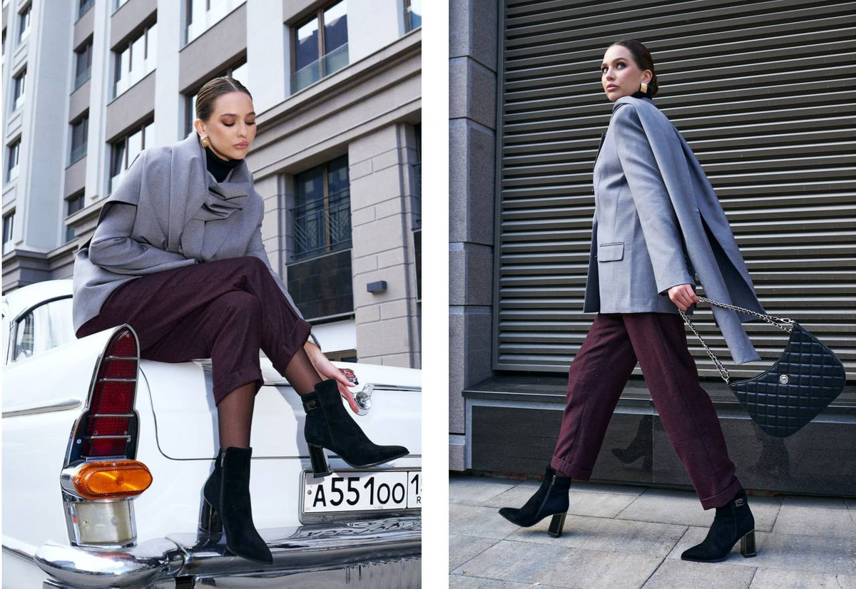 Коллекция обуви «Metallic» от Pierre Cardin предлагает интересные металлические вставки, которые придают образу особенный шарм. Металл создает дополнительный блеск и открывает новые возможности для игры с формами и фактурами. Органично сочетая металл в образе, будь это ювелирное украшение, декор на аксессуаре или обуви, вы расставляете аккуратные акценты, которые не оставят равнодушными окружающих. Эффектное сочетание текущего сезона — серый и бургунди. Благородные оттенки подойдут для спокойных будней и офиса. Металлический кант на ботильонах будет гармонично перекликаться с цепочкой сумки и золотыми серьгами. Ботильоны черные из замши, арт: W7537666. Клатч черный на цепочке из экокожи, арт: 105076I0. Используйте аксессуары! Обратите внимание, как деликатно стилист подчеркнул лакированную кожу туфель длинными черными перчатками.