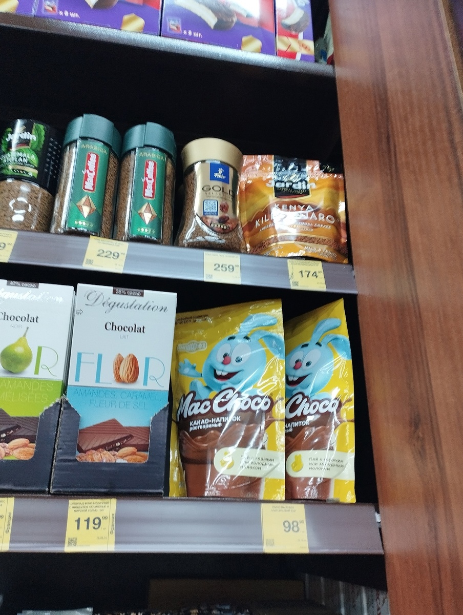 Начать на удивление хочу с того, что нашла в отделе с чаем-кофе и т.д. Теперь на полочке красуется какао-напиток в довольно яркой упаковке, но куда приятнее было увидеть его стоимость в 98 рублей. Какао неплохое, правда сладкое, но я ни капельки не пожалела о покупке. Хватает такой упаковки на долгое время, да и сам бренд плюс-минус уже популярный, нередко вижу его в разных магазинах. Заметила на полку выше растворимый кофе от "MacCoffe" в зеленой упаковке, не припоминаю такого раньше - стоит 229 рублей.