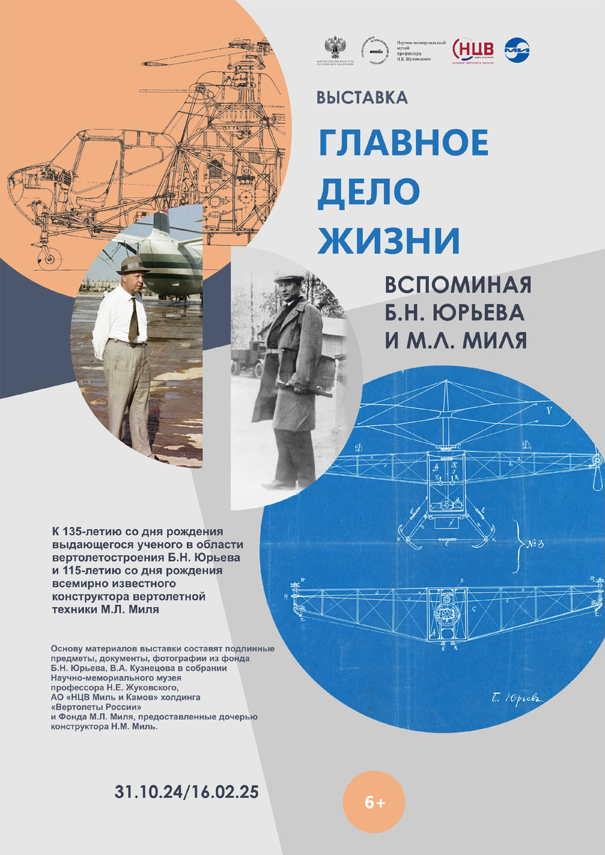 31 октября 2024 года в Научно-мемориальном музее профессора Н.Е. Жуковского - филиале ФГБУК «ГМИК им. К.Э. Циолковского» в г. Москве - открывается выставка «Главное дело жизни. Вспоминая Б.Н. Юрьева и М.Л. Миля».
