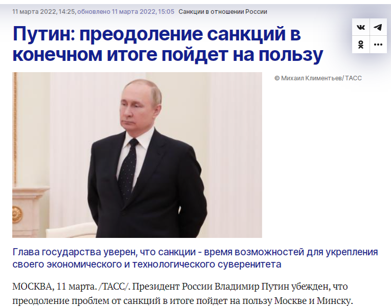 Многие уверены, что любое заявление Путина о санкциях и их пользе для страны - это реальность, подтвержденная фактами. В 2022 году и позже СМИ много цитировали Путина с его словами о том, что "санкционные ограничения, введенные в отношении России, пойдут стране только на пользу". “Попытки ограничить наше развитие предпринимались всегда. Сейчас - в большем масштабе. Уверен, что мы пройдем через эти трудности. И все пойдет только на пользу, как было и в предыдущие годы”, - заявил российский президент входе встречи с белорусским коллегой. В начале 2024 года Путин повторил примерно то же самое в Челябинске на встрече с коллективом одного из заводов. "Если бы не было ограничений, которые принимают против РФ ряд зарубежных стран, то у российских промышленных предприятий не было бы такого количества заказов", заявил Путин. Увы: реальность 2024 года эту точку зрения подтверждает все меньше. Так, по данным СМИ и агентства Bloomberg именно из-за санкций остановил производство крупнейший в России