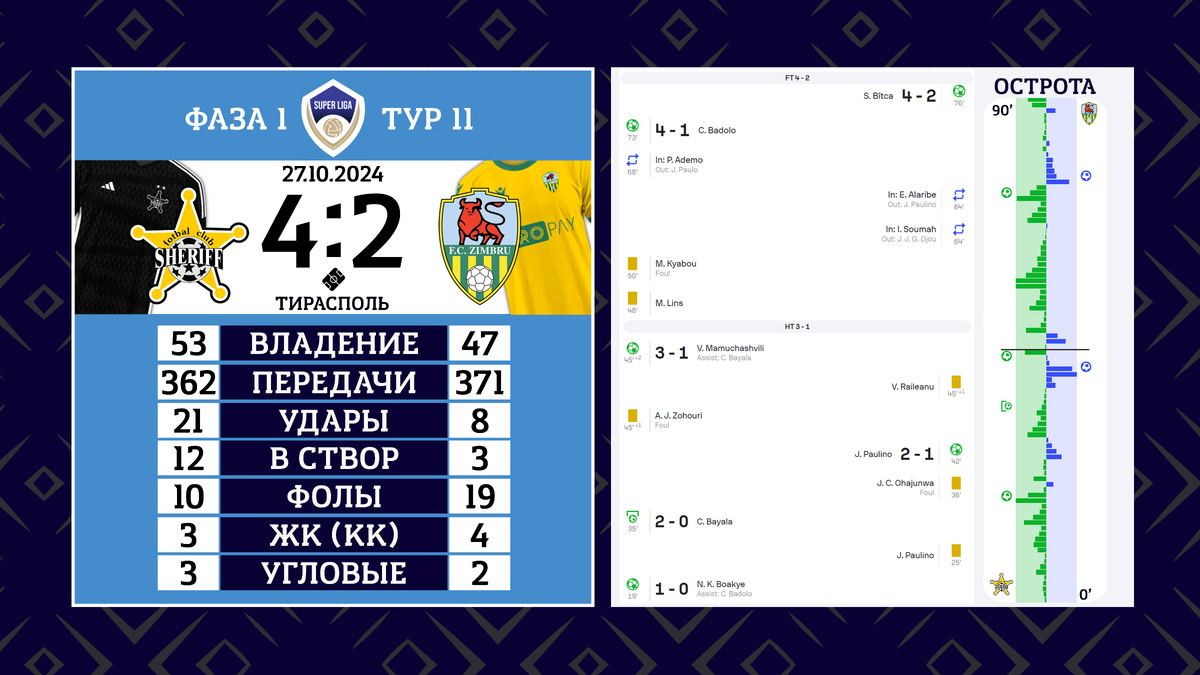 Матч проходил под диктовку хозяев. С первых минут «Шериф» завладел инициативой и контролировал темп игры. По графику активности видно, что у «Зимбру» было лишь 4 всплеска активности за матч, в то время как хозяева доминировали на протяжении большей части игры.