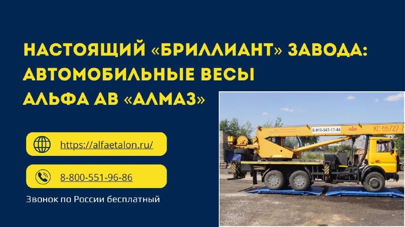 Бесфундаментные низкопрофильные автомобильные весы «Альфа АВ Алмаз» применяются для взвешивания большегрузного транспорта: погрузочные краны, фуры, тягачи и т.д.