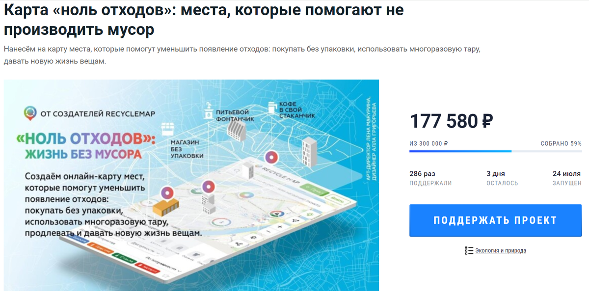 ❗️ Мы собрали 177 тысяч — 59% от необходимой суммы. Спасибо вам за поддержку! 💚 Осталось мало времени, помогите нам приблизиться к заветным 300 тысячам рублей. Эта сумма нужна нам, чтобы воплотить нашу идею — расширить возможности карты пунктов приёма вторсырья Recyclemap и добавить на неё новый слой, где будут собраны места для жизни в стиле «ноль отходов». ✏️ Мы уже рассказывали, что это за точки, но расскажем снова! И даже покажем. Итак, на новом слое появятся: 🟢 магазины и точки, в которых продают товары без упаковки, в свой контейнер на розлив и на развес, 🟢 кафе, где наливают напитки в свою кружку, 🟢 питьевые фонтанчики, автоматы с водой, молокоматы (автоматы по продаже разливного молока в свою тару), 🟢 точки розлива бытовой химии, и много чего ещё! 🔖 Благодаря нашим волонтёрам и сторонникам, мы уже собрали целую базу мест, где можно сократить отходы, в самых разных городах России. Теперь нам необходимо организовать проверку данных, посетить некоторые города, чтобы провери