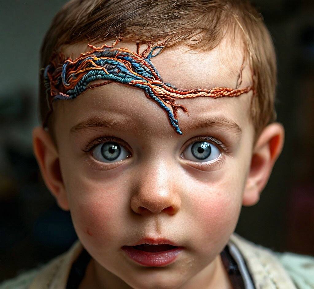 Пуповина ребёнка находится на левой части лба вместо живота. Я долго не решаюсь ее отрезать.