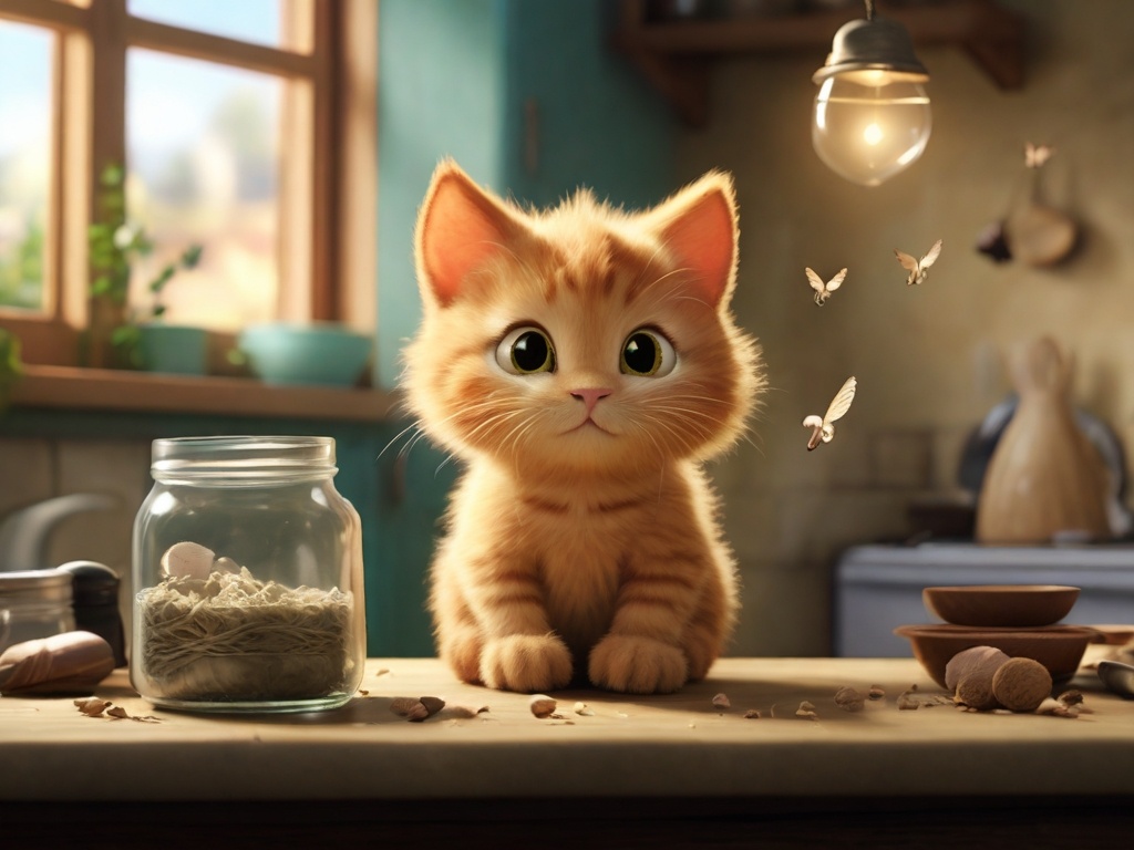 Рыжий котёнок по имени "Толстый", чуть переваливаясь на своих мягких лапках, крадучись пробрался на кухню. Над мисками с едой и яркими банками весело кружились мухи — маленькие, быстрые, такие недосягаемые! Толстый затаился у ножки стола, глаза его сверкали. Он следил за одной особо наглой мухой, которая решилась сесть прямо перед его носом. Толстый дернул хвостом и напрягся, чтобы точно рассчитать прыжок. "Вот она, сейчас я тебя поймаю," — думал он, прищурившись. Раз — прыжок! Но... Не тут-то было! Вместо того, чтобы поймать муху, он попал прямо в липкую ленту, что висела над столом. "Толстый" мгновенно запутался, лапы и усы оказались в липкой паутине. Он дернулся, пытаясь вырваться, но лента прилипала всё больше. Теперь вместо опасного охотника, он выглядел как большой, сердитый комочек с торчащими во все стороны усами. Хозяйка, услышав возмущённое мяуканье, поспешила на кухню. Увидев, как Толстый запутался в липкой ленте, она только вздохнула и ласково сказала: — Ну что ты, бедолага