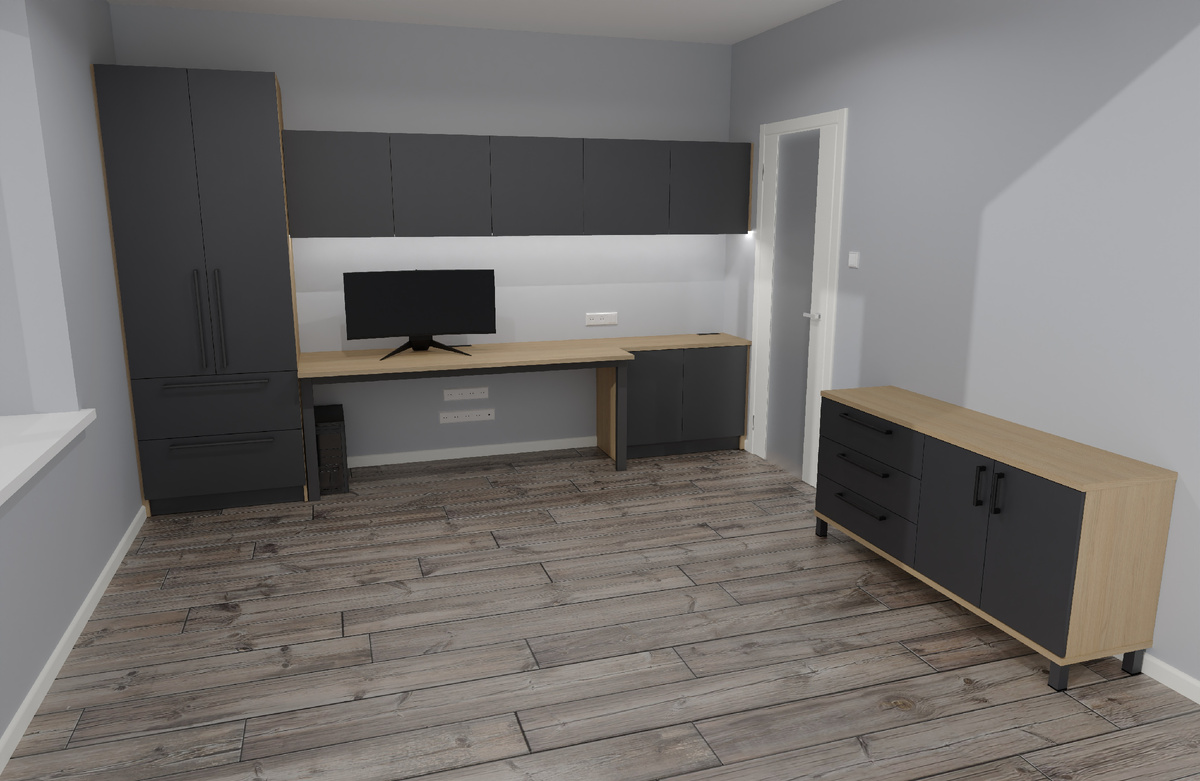 Сделали мебель для кабинета в Одинцово. Сейчас многие работают удаленно, из дома на компьютере и нуждаются в полноценном рабочем месте. У семьи из Одинцово есть возможность отвести целую комнату под кабинет для главы семейства, потому что живут в просторном доме. Очень тщательно прорабатывали проект, потом они пропали на целый год и в 2024-ом объявились. Цены уже выросли за год и существенно, пришлось пересчитывать проект полностью. По задумке должно было получится вот это. Мы этой семье уже делали три предмета мебели и когда собирали мебель в спальню, я сделал замер комнаты где должна была появиться мебель в кабинет. Корпуса мы сделали в цеху. Ножку из металла заказывали в фирме Тотал, г. Королев, обошлась она заказчику в 9000р. Итогом клиенты остались довольны. Эта мебель полувстроенная, это когда делаются корпуса, но частично они встраиваются в простенки. Например мы точили столешницу. По бокам от шкафа и правой тумбы мы точили планки-доборы. Стол, например, самостоятельно даже с