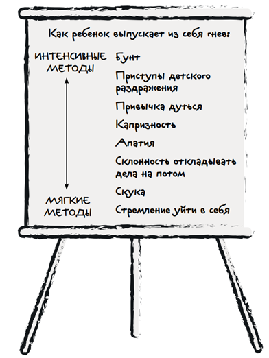 — Вы говорили, что такого рода формы неагрессивной злости со временем могут затягиваться. Но приступ детского раздражения не может длиться очень долго. — Это действительно так, — ответила Цапля, — хотя в некоторых случаях они могут быть очень даже продолжительными. Давайте подумаем о реакциях, которые могут затянуться на несколько часов, а может, и дней. — Например? — спросил Жаб. — Например, когда ребенок начинает дуться. — Дуться? — переспросил Жаб. — Никогда не думал, что дуться и злиться — это одно и то же. — А вот я думаю, что так оно и есть, — ответила Цапля. — Дуясь, ребенок ведет себя замкнуто и мрачно, хотя и непривычно тихо. Знаете, Жаб, на мой взгляд, из всех моделей поведения адаптировавшегося ребенка склонность дуться является лучшим примером использования времени с тем, чтобы смягчить гнев. Как правило, таким образом он реагирует на чужую власть, лишенный возможности поступить по-своему. Во взрослой жизни так обычно случается, когда проигрывают борьбу за власть. По большо