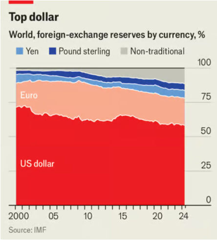 58% валютных резервов сосредоточены в долларах. Хотя доля мировых валютных резервов в долларах остается на уровне, близком к 25-летнему минимуму, признаков быстрой дедолларизации пока не наблюдается.