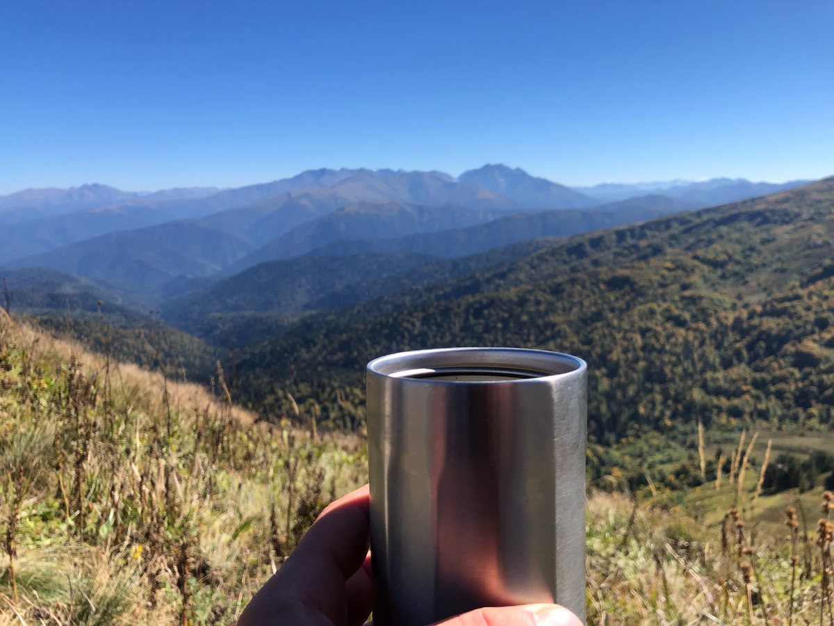 Цель дня: Переход из лагеря "Инструкторская Щель" в приют "Фишт" По опыту прохождения маршрута, знал что переход из лагеря "Инструкторская Щель" до приюта Фишт - один из самых легких переходов этого маршрута: 9 км по прямой, 1 км вниз, 2 перевела и обжитой приют, есть возможность финишировать в сумерках. Поэтому просыпаться рано и спешить не было особого смысла. Этот переход стартовали вместе примерено в 11:00. Погода подарила еще один жаркий безоблачный осенний день. Сегодня предстояло пройти 9км На третий день в горах, уже успели аклиматизироваться отдохнуть и поэтому шли на бодряках. Кружка-термос с крышкой отлично дополняла поход: компактная легкая, можно развести кофе и по пути, созерцая горы, пить! *И снова немного о маршруте:* Кстати, "Инструкторская щель", на самом деле не лагерь, как это написано на табличке, а ущелье от Яворой Поляны к Гузерипльскому и Армянскому перевалу. В Яворой поляне находиться КПП с автомобильной парковой. От туда можно дойти одним днем как до Фишта та