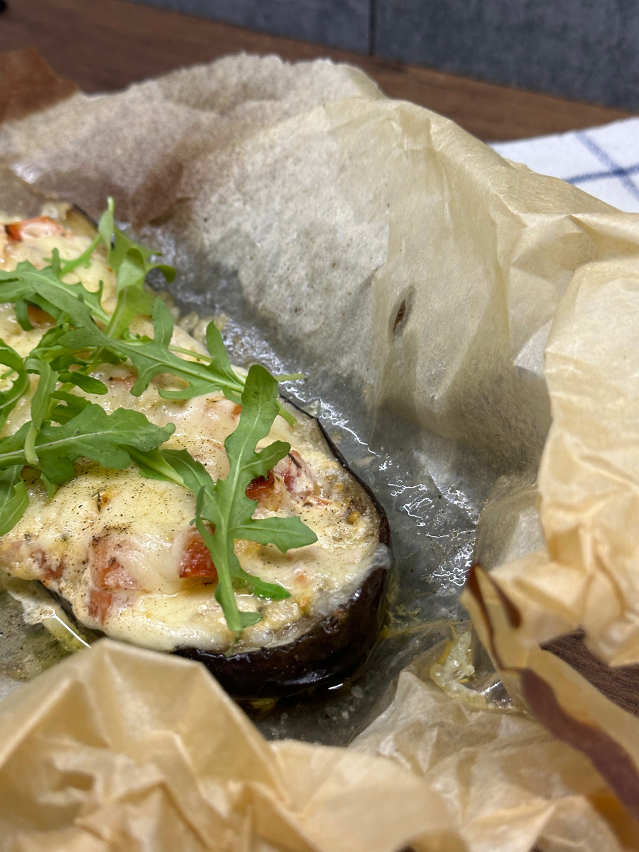 Пока я составляю сборник закусок, вот Вам рецепт запеченного баклажана с помидорами и сыром 🤎 Подойдет как на закуску так и на основное блюдо Что нам для этого нужно: - баклажан - помидор - чеснок (1 зубчик) - лук репчатый - сыр (тёртый) - майонез - соль/перец/специи - руккола Что мы с этим делаем: Всё просто, баклажан хорошо моем, режем пополам и вырезаем серединку (делаем небольшие лодочки), смазываем маслом и выкладываем на пергамент. Готовим начинку: в миску маленькими кубиками режем помидоры, мелко рубим лук и чеснок. Добавляем майонез, соль/перец/специи и перемешиваем. Наполняем начинкой наши лодочки и ставим в предварительно разогретую до 180 градусов духовку, выпекаем 25-30 минут. За 5 минут до готовности посыпаем сыром и снова отправляем в духовку. Выкладываем наши лодочки на тарелку и посыпаем рукколой. Готово! Приятного аппетита 🤎 #васинаеда #васинакухня