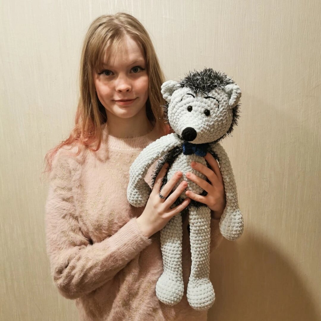Несколько лет назад у меня заказали ёжика с длинными лапками. Причем не маленького, а см 50 минимум. Для примера прислали котика причем небольшого😊 Вдохновившись котиком я начала творить. Лапки и пузико я, вязала из Himalaya dolphin baby, а иголочки из Visantia trafka меланжевая. Глазки выбрала пришивные. Пузико пришивное Ежика упаковала в коробочку и отправила в Саранск к маленькой Василисе. Ёжик получился почти с маленькую хозяйку. Хотела загрузить видео знакомство Василисы и ёжика. Но получилось только скрины с видео. Даже в руках моей дочери ежик смотрится не крошкой. Считаю, что я справилась, а как вам результат?