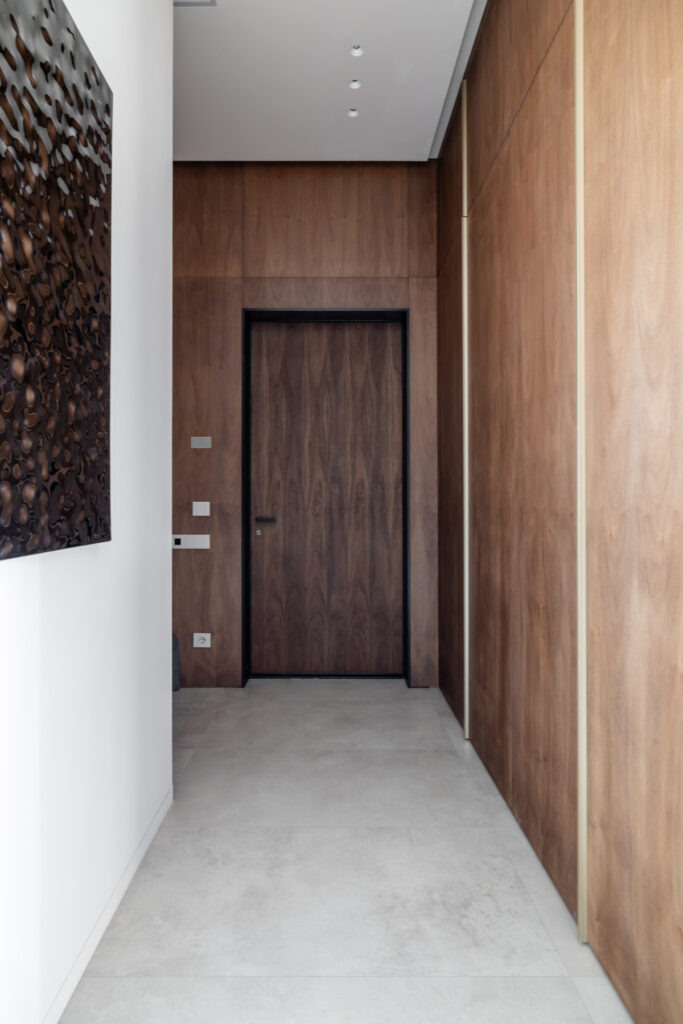 Визуальная концепция выросла из планировки. Центральный объем общей площади 70 м2 выделен материалом, формой и светом. Он начинается от входной зоны шкафом, продолжается вдоль коридора шпонированными панелями и завершается кухонными шкафами со встроенной техникой.