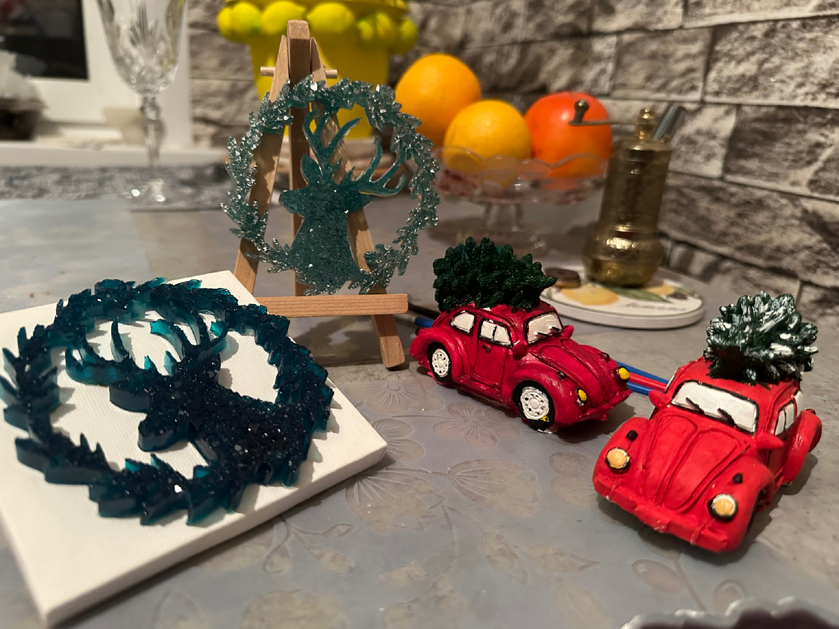 Всем привет👋 Как обещала в прошлой публикации делюсь с Вами своей идеей. Уже в начале осени мне захотелось новогоднего духа волшебства и определенно хотелось делать его своими руками ✨ Реализация обошлась мне в скромную по нашим реалиям тысячу рублей💸. Делать руками что-то сложное мне не сильно хотелось, поэтому было принято заказать с маркетплейса силиконовый молд, гипс и акриловые краски. Весь процесс от смешивания гипса с водой до нанесения последнего мазка краской составляет около часа (не считая конечно же времени застывания фигурки). Конечно можно купить уже готовую машинку в фикспрайсе или заказать из маркетплейса, но вся суть в кайфе от того что сделал что-то красивое своими лапками🐾 Кстати отлично подходит для сброса стресса. Схема простая: Меня эта идея вдохновила и теперь я планирую сделать целую парковку из новогодних красных авто, которые перед праздником разъедутся на сувениры коллегам🫶 Я не стала останавливаться только на гипсе, душа требовала продолжения и был