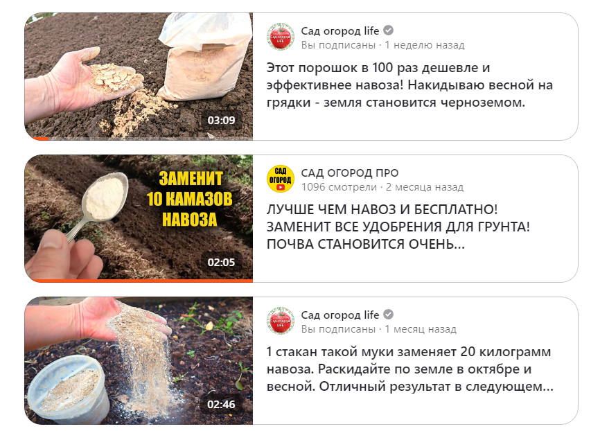 Например в статье "Стакан муки вместо 15 килограмм навоза. Можно раскидать даже по снегу (весной не узнаете свою землю)" автор пишет: