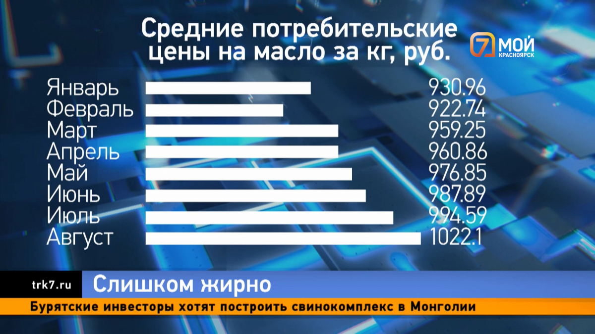 Молока, правда, нужно много: для одного килограмма масла используют 20-30 литров. Хоть и оно тоже растёт в цене, это не так сильно бьёт по кошельку. По данным «Красстата», в Красноярске с начала этого года стоимость молока средней жирности поднялась от двух до шести рублей. Молоко жирностью выше в августе в среднем стоило на пять рублей дороже, чем в январе этого года. Масло же за год подорожало почти на 10%, и сейчас за килограмм придётся отдать уже больше тысячи.