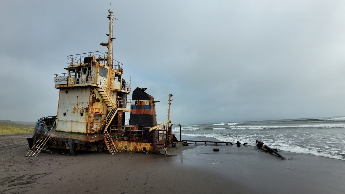 Долго думала, что же рассказать про этот день. Не потому что, нечего сказать. А потому, что не знаешь, как выразить весь тот шквал эмоций, который на тебя обрушивается, когда ты вдруг выезжаешь из-за поворота и видишь ОКЕАН!!! Всю ту мощь, всю ту бесконечность! Даже сейчас, вспоминая о том моменте, у меня бегут мурашки по коже и ком в горле. Тут невозможно рассказать, тут просто надо быть, надо видеть, поэтому минимум слов: Океан он был разный, с утра он был хмурый и величественный. А потом выглянуло солнце и всё изменилось: Буксир «Корунд» севший на мель чем то напоминает Терибирку: Артем рассказывал, что после случившегося оставили человека сторожить этот буксир. Вот не соврать бы, он года 4 прожил на берегу, охраняя судно. Там какие-то были затяжные суды со страховой компанией. Лазили по пещерам и тоннелям: А еще заезжали в военный городок Горный. Он частично заброшен, угнетающее производит впечатление, хоть я и люблю заброшки, есть в них какая-то прелесть и уходящ