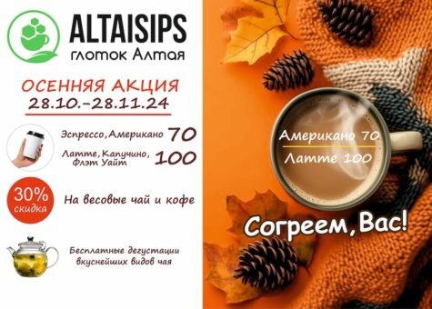 Осень – это самое красивое и контрастное время года. В эти промозглые пасмурные дни хотим согреть Вас ароматными неповторимыми сортами чая и кофе со всего мира. Подарить теплое уютное время в кругу семьи. ЦЕЛЫЙ МЕСЯЦ с 28 октября по 28 ноября Вас ждет ОСЕННЯЯ АКЦИЯ!!!* — горячий зерновой невероятно ароматный Кофе с собой по 70 руб. (Американо, Эспрессо) и 100 руб. (Латте, Капучино, Флэт Уайт) из 100% Арабики; — скидка 30% на весовой чай и кофе — бесплатные дегустации УРААА, СОВЕРШАТЬ ПОКУПКИ СТАЛО ЕЩЕ ВЫГОДНЕЕ!!! Теперь каждый покупатель может оформить бонусную карту. При любой покупке, возвращается 5% кэшбэк, который можно потратить на весовой чай и кофе или кофе с собой. С бонусной картой условия акции будут для Вас бессрочные. В магазинах Altaisips Глоток Алтая представлен большой выбор готовых запоминающихся подарков. Также Вы можете собрать подарок на свой вкус из огромного ассортимента на любой праздник и красиво упаковать. Только у нас можно заварить любой весовой чай и взять ча