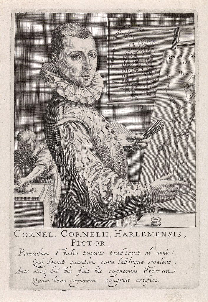 Голландский художник Корнелис Корнелиссен родился в 1562 году в Харлеме в семье состоятельных родителей. С примерно 1572 года по 1578 год он был учеником известного антверпенского художника Питера Питерса (1540-1603). В 1579 году юный Корнелиссен решил отправиться на корабле во Францию (вероятно, направляясь в Париж), но по прибытии в портовый город Руан был вынужден из-за чумы поменять планы и через какое-то время перебрался в Антверпен. Он навсегда переехал в Харлеме в 1580/81 году, где в 1583 году получил свой первый официальный заказ (групповой портрет ополченцев). Примерно в 1584 году он подружился с художниками Хендриком Гольциусом (1558-1617) и Карелом ван Мандером (1548-1606). Вместе они основали так называемую Харлемскую академию, которая процветала в 1588-90 годах, и, возможно, просуществовала вплоть до 1600 года. Между 1590 и 1593 годами Корнелис написал четыре картины для Принсенхофа по заказу города Харлема. Позже он также выполнял муниципальные заказы для гражданск