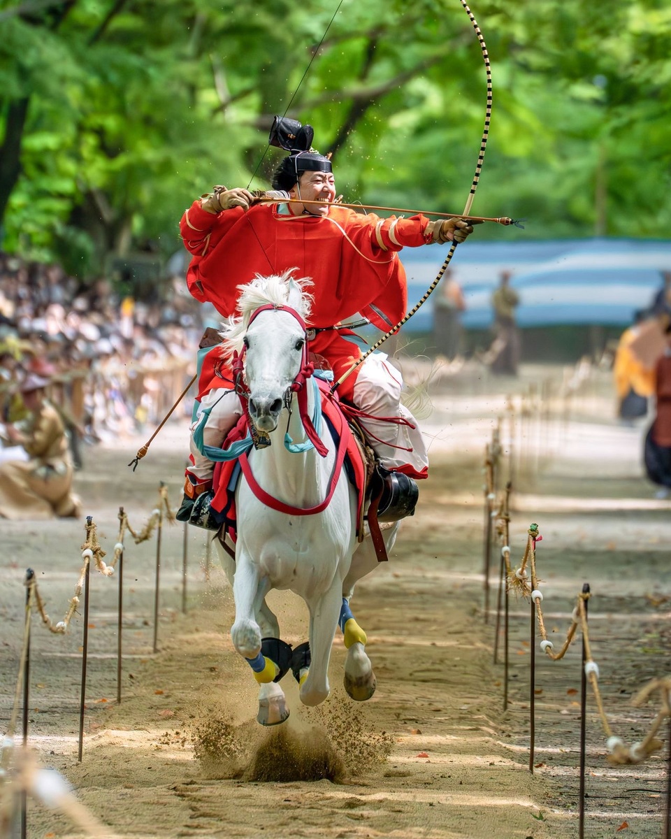 На ежегодных праздниках, проходящих по всей Японии, выезжают одетые в традиционные охотничьи одежды лучники, скачут галопом по 250-метровой дорожке и стараются на скаку поразить стрелой неподвижную мишень.