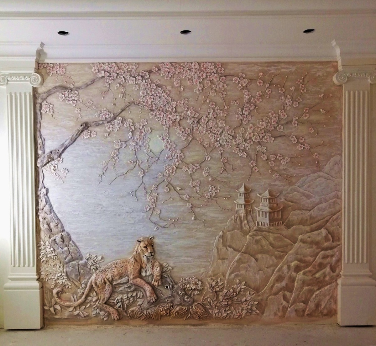 Занимать барельефом такую площадь стены хорошо, когда площадь комнаты это позволяет. Ведь такую работу, как и большинство художественных работ в интерьере, нужно, прежде всего, видеть в целом и оценивать издалека. В этом случае площадь позволила. На некоторых фото я специально усилила цвет, чтобы лучше было видно детали. Но настоящая гамма очень светлая, пастельная. Вот здесь, в свете солнца, видно цвета лучше всего. Да, можно делать и яркие покраски, но барельеф, прежде всего, должен гармонировать с интерьером. И не брать на себя слишком много внимания. В следующей статье я рассмотрю эту работу более подробно и поделюсь рабочим процессом.