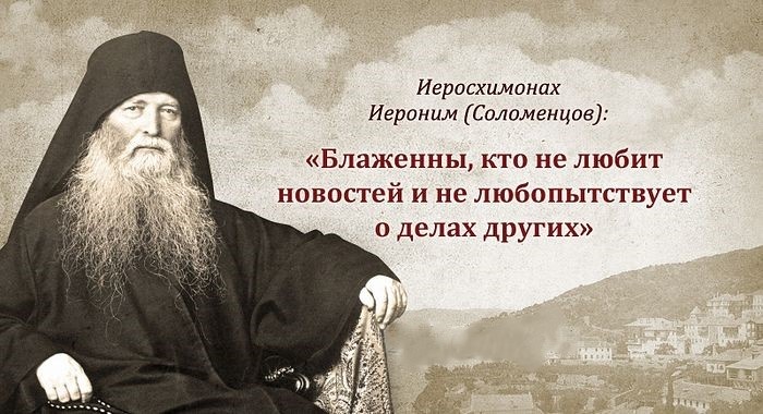 "Новостям конца не будет, а жизни нашей будет конец. Нам надо смотреть , чтобы не упустить время к покаянию. Того ради хорошо не обращать внимание на новости, которые разоряют нас вконец. Блаженны те, кто не любит новостей и не любопытствует узнавать о делах других людей! Так говорил иеросхимонах Иероним (1802-1885). Подвизался он в Русском Свято-Пантелеимоновом монастыре на Афоне. На протяжении ста лет считался одним из самых почитаемых подвижников обители. Новости , конечно, знать не так плохо. Что творится в мире. В общих чертах. Мы же не Маугли. Он говорит о тех новостях, которые "разоряют нас... " Новостную ленту, если пролистать, даже не опытный медийщик, а рядовой обыватель увидит важные новости страны, допустим, и "мусорные" глупые повестки из мира шоу-бизнеса, например. А вот сегодня я хочу поговорить о делах других людей. Искренне не понимаю, как можно часами сидеть на телефоне, чате, соц.сети, перемывая кости обсуждая жизнь своих знакомых и знакомых своих знакомых и даже