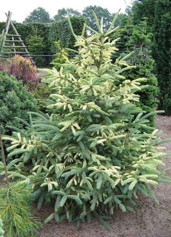 Ель канадская Дент — это уникальный сорт, который привлекает внимание своей необычной формой и окраской хвои. Это ширококоническое дерево, достигающее высоты 2 метров и ширины 1 метра через 10 лет, с максимальной высотой 4-5 метров. Характерной особенностью являются неравномерные изменения цвета хвои на молодых приростах: некоторые весенние побеги полностью кремовые, а другие — частично. Это дерево не подвержено выгоранию на солнце, что делает его отличным выбором для открытых пространств. Особенности.