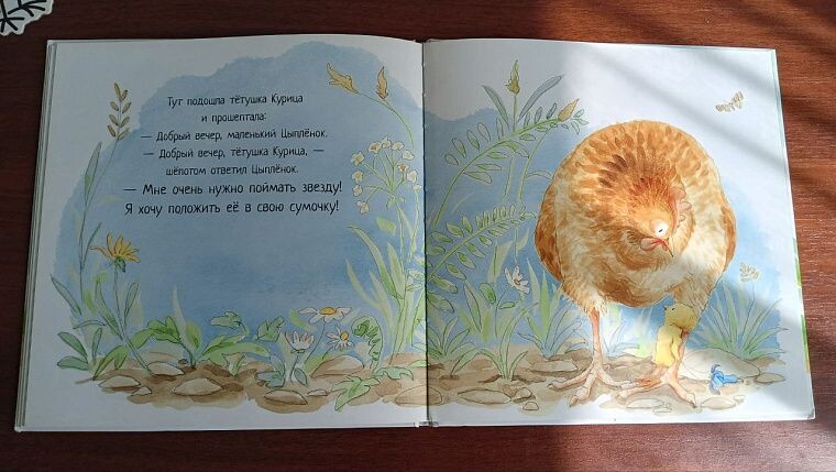 Я начала искать подходящие книги в магазинах. В одном из них мне попалась история о маленьком цыплёнке. Моё внимание сразу привлекло описание, в котором говорилось о мечтах маленького цыплёнка. Мне сразу вспомнилось детство и то, как я любила постоянно фантазировать, представлять себе какие-то чудеса и мечтать о чём-то большом и важном. Я купила эту книгу и не прогадала, дочка просила её читать постоянно. Эта книга очень хорошо подходит для детского восприяти