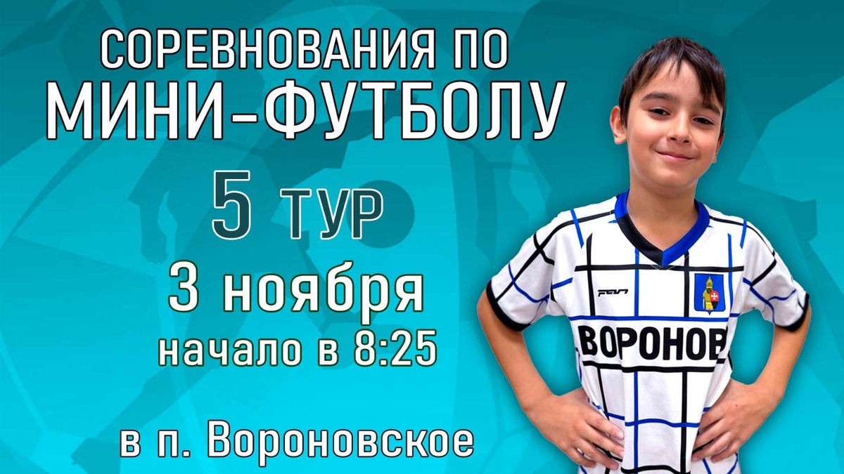 03.11.2024 года (Воскресенье) пройдет 5 тур соревнований по мини-футболу МБУ "СК "Вороново" среди детей 2011-2012, 2013-2014, 2015-2016 г.р.