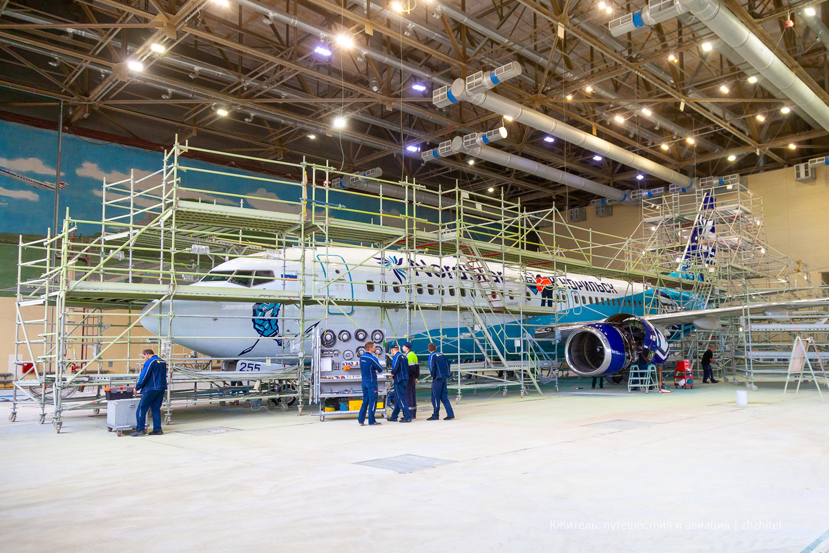 Недавно побывал в Минеральных Водах на одном из крупнейших предприятий по покраске самолётов. Повод был очень интересный: авиакомпания NordStar решила обновить ливрею одного из своих бортов и посвятить ее хоккейному клубу «Норильск». Полностью процесс покраски самолета занимает около двух недель, если ливрея сложная, то больше, если простая, то меньше. Эта ливрея сложная из-за нескольких используемых оттенков голубого и синего цветов, наличия мелких элементов и множества изогнутых линий, которые нужно идеально точно нанести на поверхность самолета. На бумаге или экране монитора всё кажется просто, но фюзеляж самолёта имеет очень сложную форму. Основные элементы специальной ливреи: изображения хоккеистов, рычащий медведь — символ хоккейного клуба и огромная шайба, летящая в ворота соперника. Я прилетел в Минеральные Воды на базу технического обслуживания и покраски самолетов S7 Technics, где красят, а также выполняют полное техническое обслуживание самолетов, уже на финальном этапе по