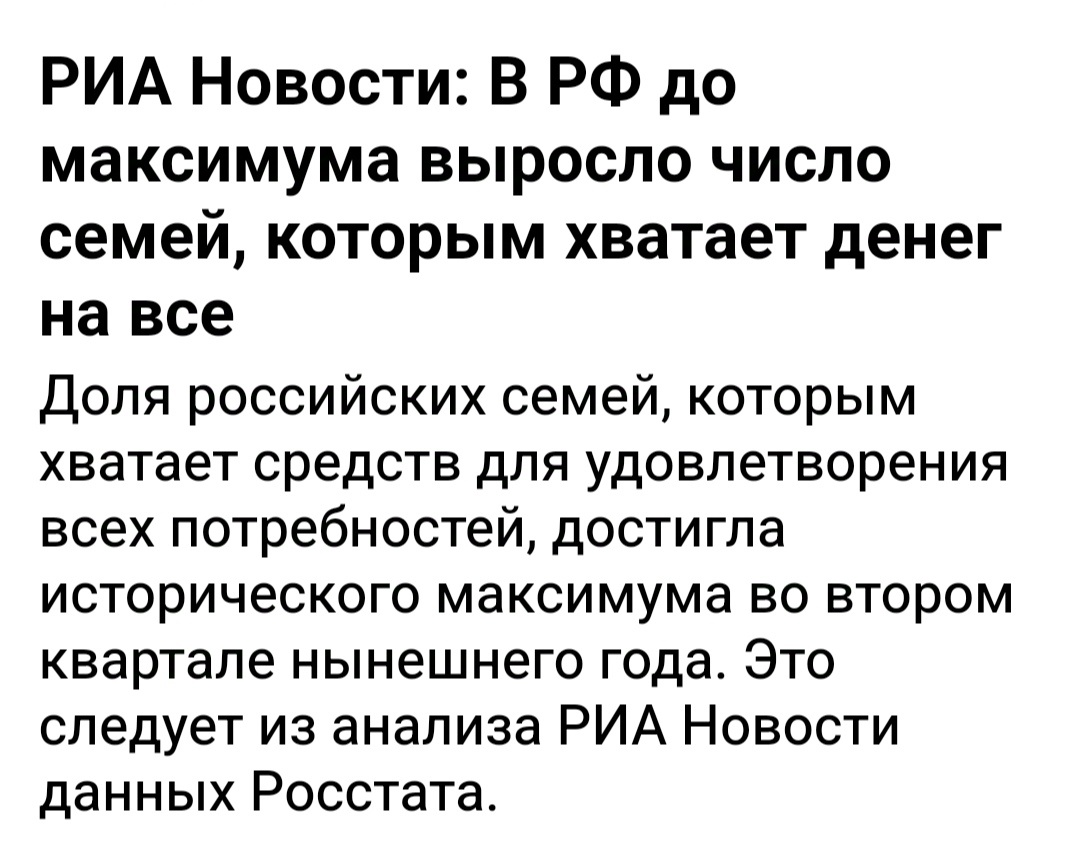 День сегодня как обычно начался с просмотра новостей и сразу прямо в лоб главная новость в ленте - доля российских семей, которым денег хватает на все, достигла максимума. Эта страна... Нет, НАША страна, которая одна из самых богатых в мире, кстати, и на ресурсы которой многие и многие глаз положили, НИКОГДА не будет жить хорошо. Потому что страна эта уже давно не принадлежит ее народу, а сам народ оболванен и обдурен настолько, что уже не способен отличить белое от черного. А может уже просто не хочет? Устал. Очевидное - оно ведь всегда очевидное. Поэтому что бы там не говорил Росстат, правда всем известна. И про Зазеркалье все тоже знают. Оболванивание собственного народа - это главная задача власти, которая об этом народе ни разу не заботиться, сама по себе является преступной, но стремиться самосохраниться любыми возможными способами. Ложь - она во спасение самой власти в первую очередь. Росстат (Федеральная служба государственной статистики) — федеральный орган исполнительной