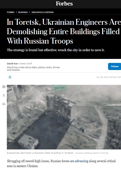 Forbes, со ссылкой на видео 101-й гвардейской бригады ВСУ, пишет о замечательном во всех отношениях плане защиты города от наступающих российских подразелений, родившемся в мозгах у креативного украинского командования. “Несмотря на высокие потери, российские войска продвигаются по нескольким критически важным направлениям на востоке Украины. Русские захватили Селидово, один из городов, которые ранее поддерживали украинскую оборону вокруг города-крепости Покровск. Тем временем ускорение российского продвижения к западу от Донецка, в 25 милях к юго-востоку от Покровска, может привести к тому, что украинские силы отступят из города Курахово, взорвав мосты через близлежащую реку Волча и перегруппировавшись за завалами.Но есть один сектор, где русские не продвигаются. В городе Торецк, в 30 милях к востоку от Покровска, продвигаются украинские войска, хотя и не очень быстро и не очень далеко.То, как украинцы сумели отвоевать несколько кварталов в Торецке, городе с довоенным населением в 35