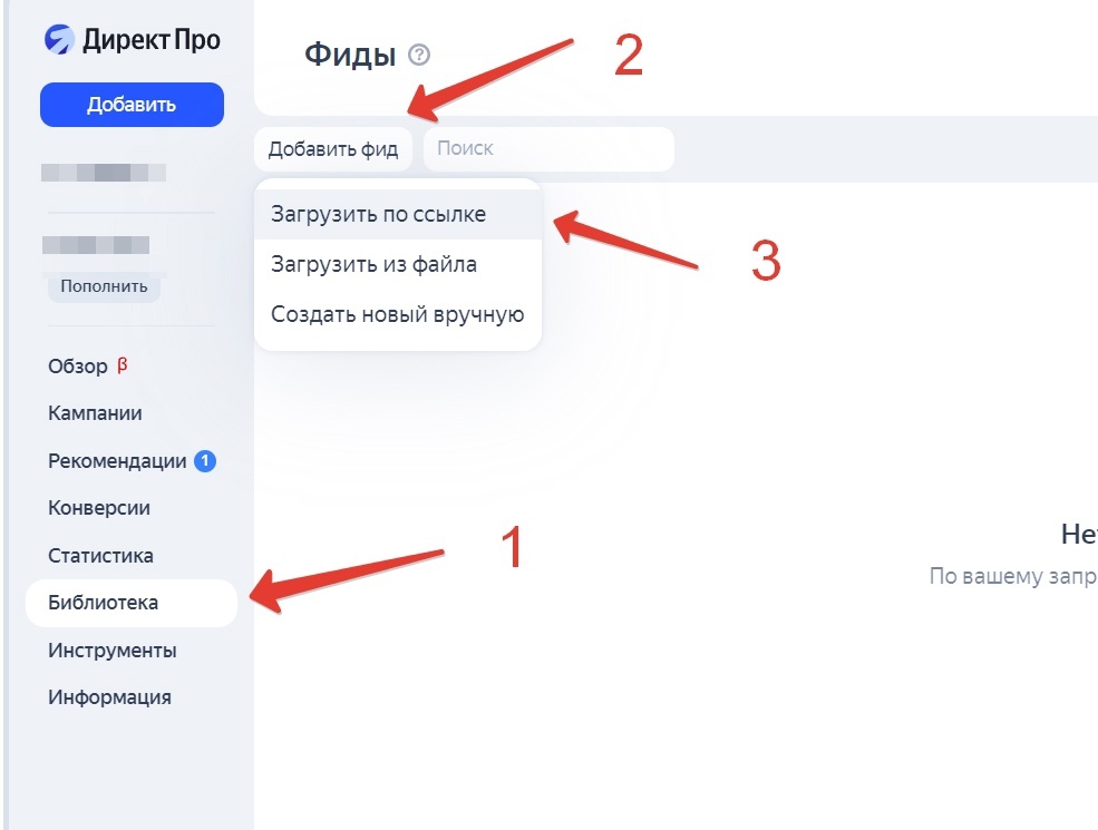 Прежде, чем приступить к настройке, нужно создать фид для товаров в интерфейсе Директа. Фид создается очень просто; следуйте инструкциям на скриншотах: