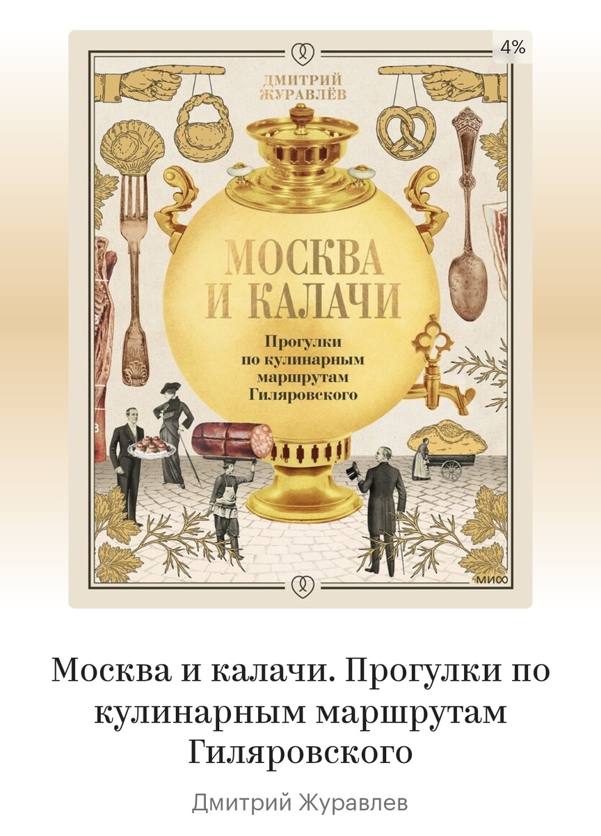 Регулярно читаю телеграм-канал «Щи натощак» и паблик «Хроники русской кухни» в ВК. Ведет их уважаемый Дмитрий Журавлев, который при всем его увлечении дореволюционной кухней умудряется не скатиться в полное отрицание советского периода нашей истории, как пищущий примерно о том же «Рябчик в сметане» Максим Марусенков, подающий себя знатоком «настоящей русской еды». Так вот относительно недавно, примерно в конце прошлого года, Дмитрий Журавлев выпустил книгу «Москва и калачи». Это сборник рецептов русской кухни с привязкой к некоторым историческим мотивам, а именно к известным по документам и литературе меню московских трактиров. Привязка сделана, конечно, в первую очередь по «Москве и москвичам» Гиляровского. Рецепты в книге есть как жлобские, вроде «стерлядок кольчиком» так и вполне себе реально готовящиеся из продуктов в ближайшей "Пятерочке". Про щи из квашеной капусты написано прямо так вкусно, что хочется немедленно поставить томиться приварок, чтобы потом «навернуть горячих щец»,