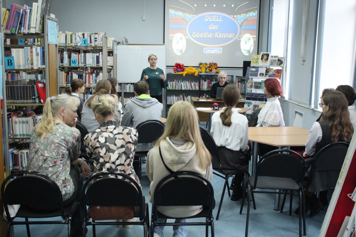Сотрудники нашей библиотеки совместно с кафедрой немецкого языка Смоленского государственного университета в рамках профориентационной работы провели мероприятие, посвященное 275-летию со дня рождения Иоганна Вольфганга фон Гёте. В интеллектуальной игре в формате телешоу соревновались сборные команды гимназии №1 им. Н. М. Пржевальского, лицея им. Кирилла и Мефодия, средних школ № 34 и № 29. По итогам пяти раундов «Блиц-опрос», «Правда или ложь?», «Универсальный гений», «Игра с Фаустом» и «Игры разума с Гёте» компетентное жюри определило победителя. Набрав 1010 баллов, главный приз завоевала команда «Читатели Фауста» лицея имени Кирилла и Мефодия. Поздравляем ребят и желаем успехов в изучении немецкого языка!