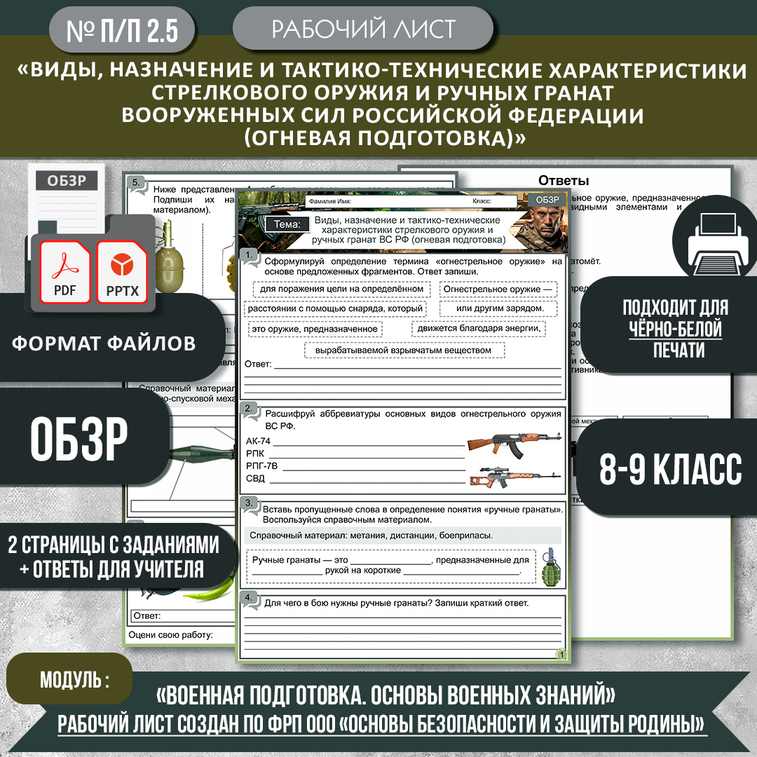 Рабочий лист на тему «Виды, назначение и тактико-технические характеристики стрелкового оружия и ручных гранат Вооруженных Сил Российской Федерации (огневая подготовка)» включает 7 заданий, размещённых на двух страницах. На третьей странице представлены ответы для преподавателя. Данный материал разработан в соответствии с требованиями новой ФРП «Основы безопасности и защиты Родины» ОБЗР (для 8–9 классов образовательных организаций). Список заданий данного рабочего листа: Рефлексия. Рабочий лист «Виды, назначение и тактико-технические характеристики стрелкового оружия и ручных гранат Вооруженных Сил Российской Федерации (огневая подготовка)» доступен в формате PDF, а также в редактируемом формате PPTX. Его можно распечатать как в цвете, так и в черно-белом варианте (в галерее представлена демонстрация данного рабочего листа в черно-белом исполнении). Рабочий лист «Виды, назначение и тактико-технические характеристики стрелкового оружия и ручных гранат Вооруженных Сил Российской Федераци