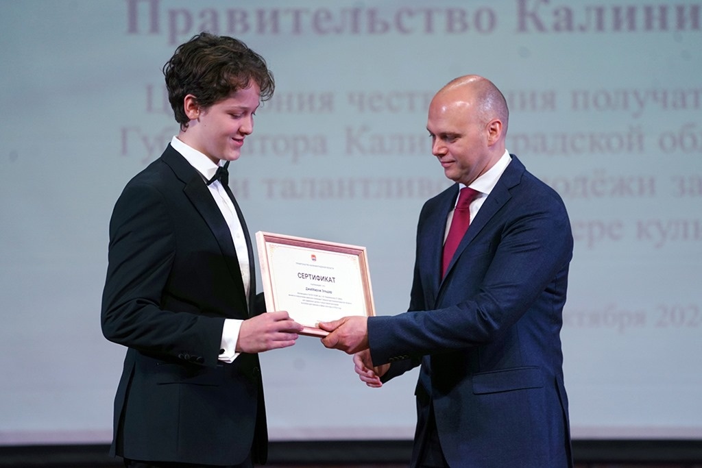 Губернатор Калининградской области Алексей Беспрозванных вручил именные стипендии в сфере культуры и искусства: получателями стипендий стали 125 учащихся различных образовательных учреждений. Стипендия устанавливается на один учебный год и выплачивается ежемесячно. Отбор проводился региональным министерством по культуре и туризму совместно с «Ресурсным образовательно-методическим центром» среди учащихся школ искусств, лицеев, гимназий, школ и воспитанников домов творчества детей и юношества, учащиеся филиала Центральной музыкальной школы при Московской Государственной консерватории имени П. И. Чайковского «Балтийский» и Калининградского областного музыкального колледжа им. С. В. Рахманинова. Все участники отбора являются лауреатами международных, федеральных, региональных конкурсов и участниками форумов. Беспрозванных выразил гордость за успехи молодых талантов и пожелал им дальнейших успехов. На церемонии выступил Детско-юношеский симфонический оркестр Калининградской области и Образц