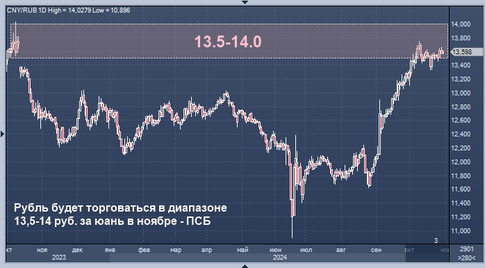Рубль будет торговаться в диапазоне 13,5-14 руб. за юань в ноябре - ПСБ Курс доллара к рублю расчётный, фьючерс, вечный фьючерс и межбанк. Курс евро к рублю расчётный, фьючерс, вечный фьючерс и межбанк. Курс юаня к рублю биржевой, фьючерс, вечный фьючерс и межбанк. Валютная пара юань/рубль будет торговаться в диапазоне 13,5-14 руб. за юань в ноябре с медленным движением к его верхней границе, прогнозирует аналитик Промсвязьбанка (ПСБ) Денис Попов. Сезонный рост предложения иностранной валюты второй месяц подряд проявляется лишь в локальной стабилизации курса рубля. Это может указывать на устойчивость трека к постепенному ослаблению курса рубля на фоне выраженности проблем с возвратом экспортной выручки из-за вторичных санкций, отмечает эксперт. По мнению Попова, на возможное продолжение ослабления рубля указывает рост импорта, который активизировался в последние месяцы на фоне сезонных факторов, а также наблюдаемый с начала недели пересмотр вверх стоимости юаневой ликвидности на внутре