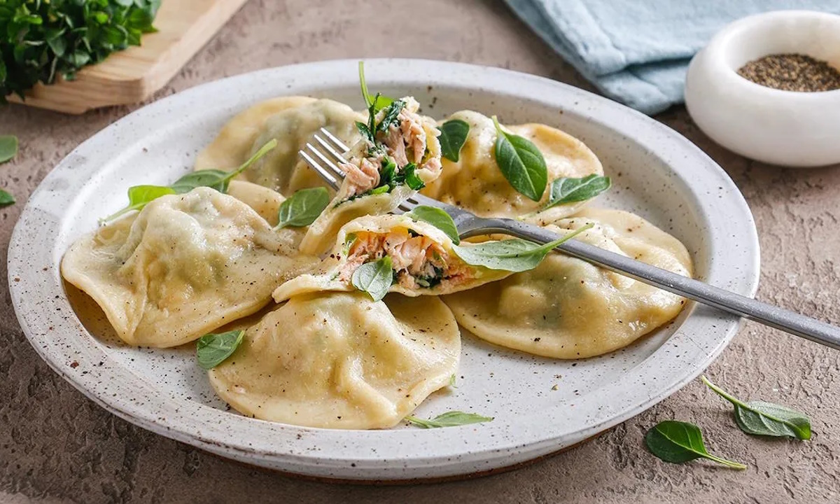 В русской кулинарной традиции равиоли, это те же пельмени или вареники. В зависимости от начинки. Итальянцы считают это блюдо одним из видов макаронных изделий. Что бы не путаться и не спорить, разумнее всего выделить равиоли в отдельную гастрономическую группу, тем более, что разнообразие рецептов этому способствует. Базовая основа равиоли, тесто отличается от пресного пельменного теста. В его состав входят желтки, мука и оливковое масло. Начинки — простор для фантазии, экспериментов и кулинарных изысков. Ингредиенты: Как готовить Очищенные креветки мелко режем, половину мягкого сыра (предпочтительно овечьего), крошим, твердый сыр натираем на мелкой терке, петрушку и базилик рубим максимально мелко. Смешиваем все, добавив лимонный сок, соль и перец. Равиоли с такой начинкой не раскроют полноты вкуса без соуса. Для приготовления соуса увариваем сливки на треть объема. Добавляем оставшийся раскрошенный мягкий сыр и пробиваем блендером до однородного состояния. Добавляем соль, перец, п