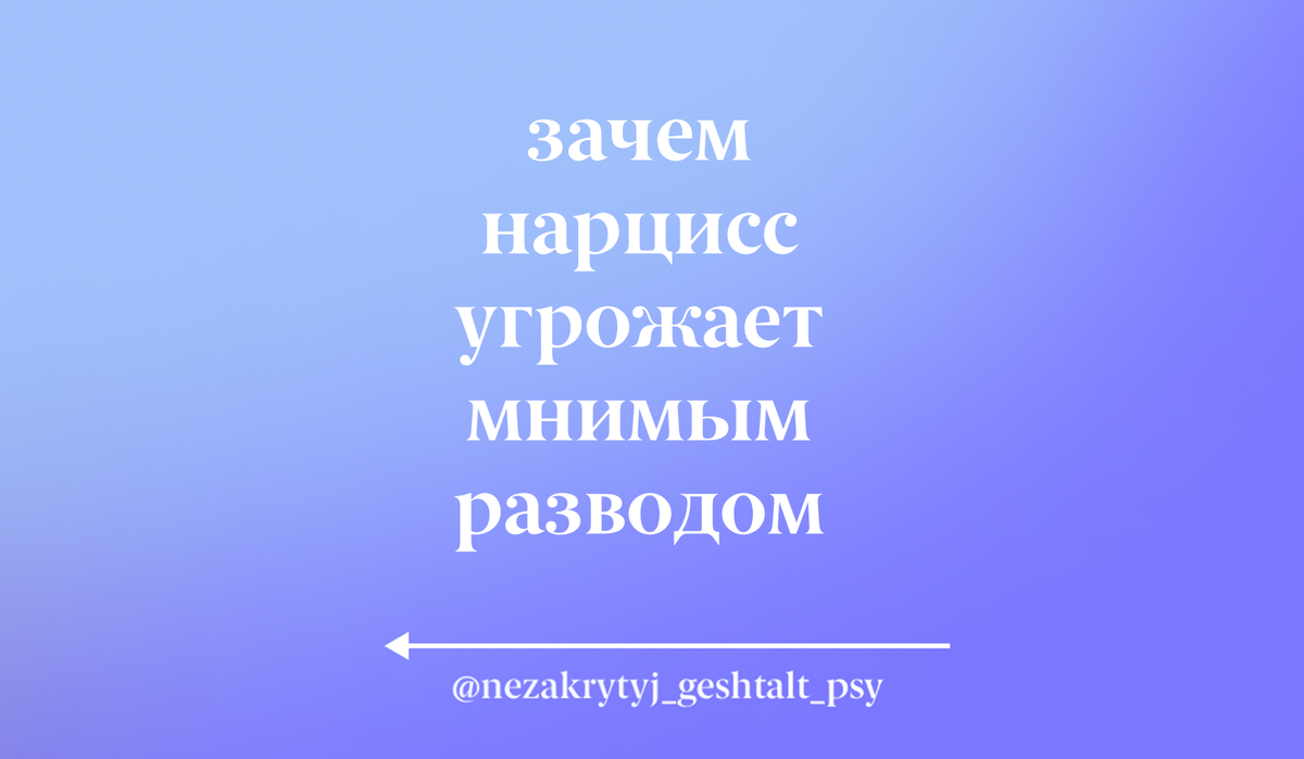 Угроза разводом, брошенная воздух без реального намерения - хороший способ потрясти энергию и раскачать на эмоции. Холодный душ, как принято говорить на сленге. Угроза отвержением. Люди воспринимают такое по-разному, так как у каждого свой чувственный диапазон. Кто пропустит мимо ушей, имея высокую толерантность к эмоциональному шантажу, а кто примет это послание глубоко в сердце... и ранится. Эта угроза может вызвать страх, ощущение нестабильности. Я считаю, что ничего хорошего в этом нет. Можно не провалиться в вину, не ощущать себя униженным, не ощущать собственную никчемность, Можно просто потухнуть. И чувствовать грусть. Отсутствие созвучия между значимостью семьи для себя... И тем, как легко нарцисс оперирует возможностью прекратить существование этой семьи. И ощущать бессилие. А нарцисс такими угрозами преследует конкретную цель: Для понимания, какую динамику я описываю - бывает, что люди объявляют о разводе. Это их реальное намерение - прекратить отношения. Имеют право - знач