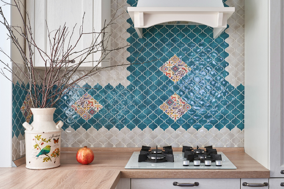 На кухонном фартуке мозаичные элементы из серии «Арабески майолика» образуют стройную многоцветную композицию. Дизайнер Светлана Пахомова применила здесь два базовых цвета – белый и бирюзовый, но решила не ограничиваться однотонной мозаикой. Пёстрые майоличные вставки позволили сделать этому интерьеру дополнительную «инъекцию цвета».
