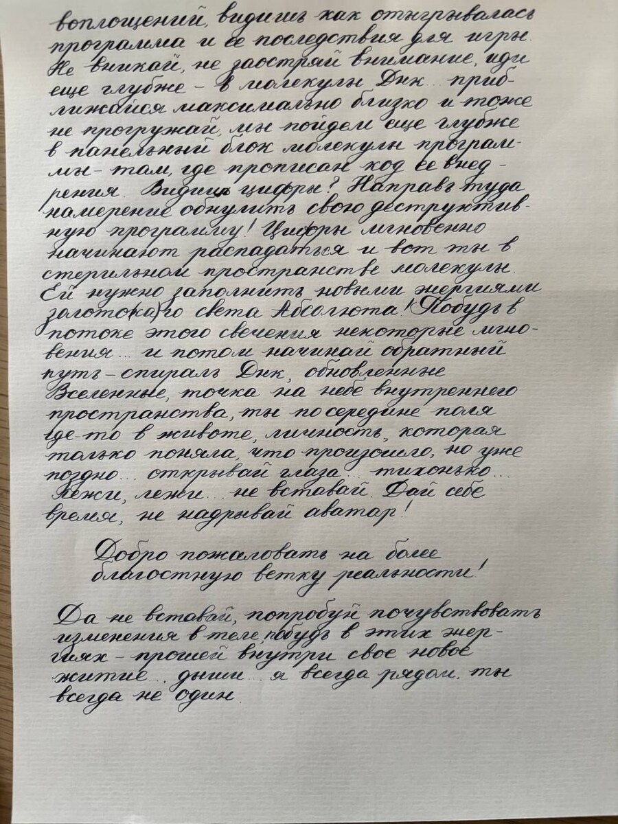 #книгабудущего -- Я не продумываю структуру книги -- Не разрабатываю точки кульминации и выброса адреналина -- Не ищу захватывающие истории во вне Просто каждый день беру лист бумаги, перо, тушь и начинаю писать с абсолютно пустой головой. Это мой личный эксперимент и вклад в мир. Но это уже сейчас показывает результаты — у меня и у многих из вас. Но, как же это все ладненько складывается в обычную (но так ли это?) историю. На днях взяла и посмотрела с самого начала и до вот этой практики. Все как и должно быть. И практика на 9 и 10 страницах — чудо, которое завершит у каждого то, что именно ему не нужно и позволит войти в новое. Как дополнение к новой букве .ТОННО. (через пост чуть выше). Как читать, чтобы «работало»? Просто перед чтением поставить намерение «получится» и пойти в доверие. -- Можно просто прочитать и прочувствовать с открытыми глазами -- Можно прочитать и потом это еще и проделать внутри ..по памяти.. Нет правил Нет указаний Нет необходимости что-то зазубривать Нет ин