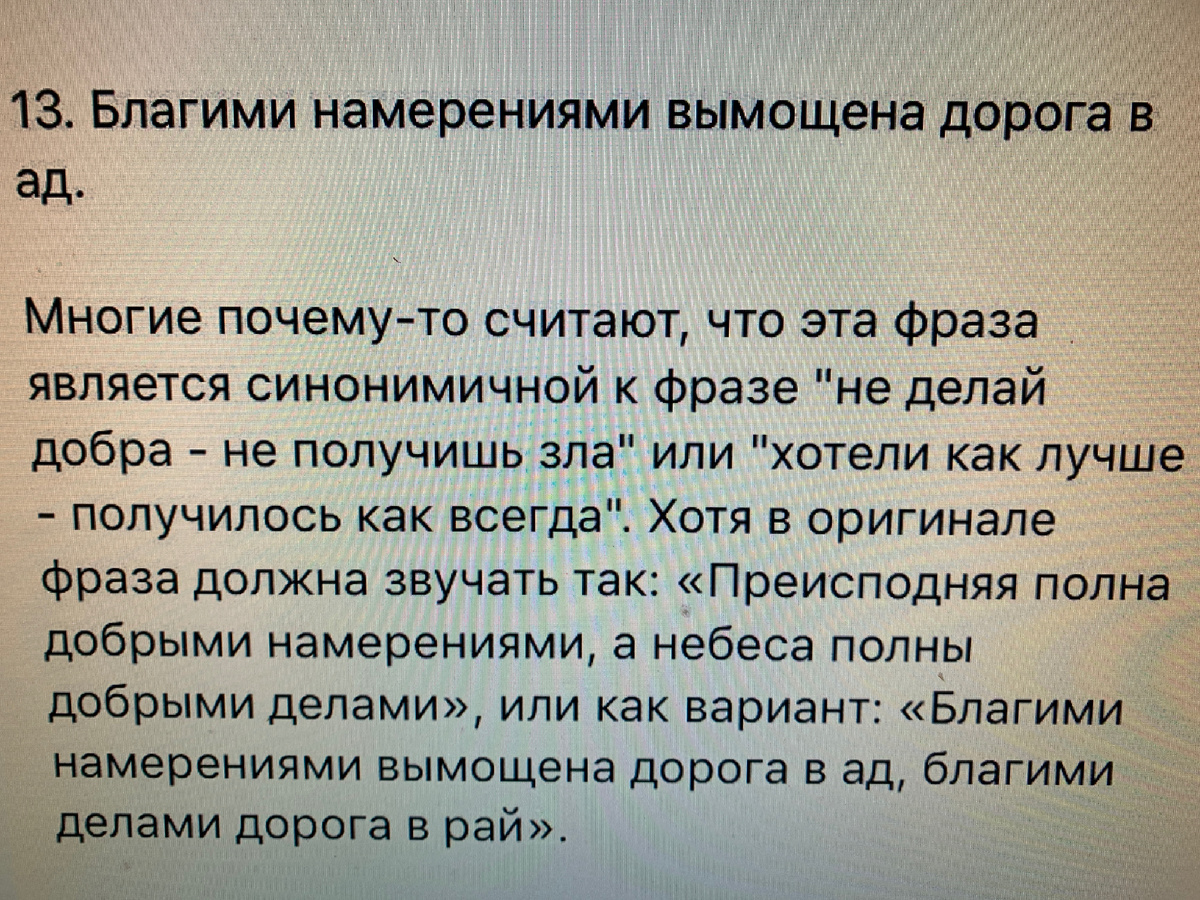 Уверен, что очень многие Кремлевские чиновники даже не понимают подлинного смысла этой Библейской мудрости, заключающейся на самом в том, что " благими намерениями вымощена дорога в ад" означает, что те, кто с презрением отвергают благие намерения, кто не следуют им. то есть вместо добрых и хороших дел и поступков намерений, кто совершают злодеяния, совершают преступные деяния,, творят подлости ближнему, низости, те по сути пренебрегают, то есть попирает ногами добрые благие намерения, и они поэтому именно неизбежно и попадут прямиком в ад.