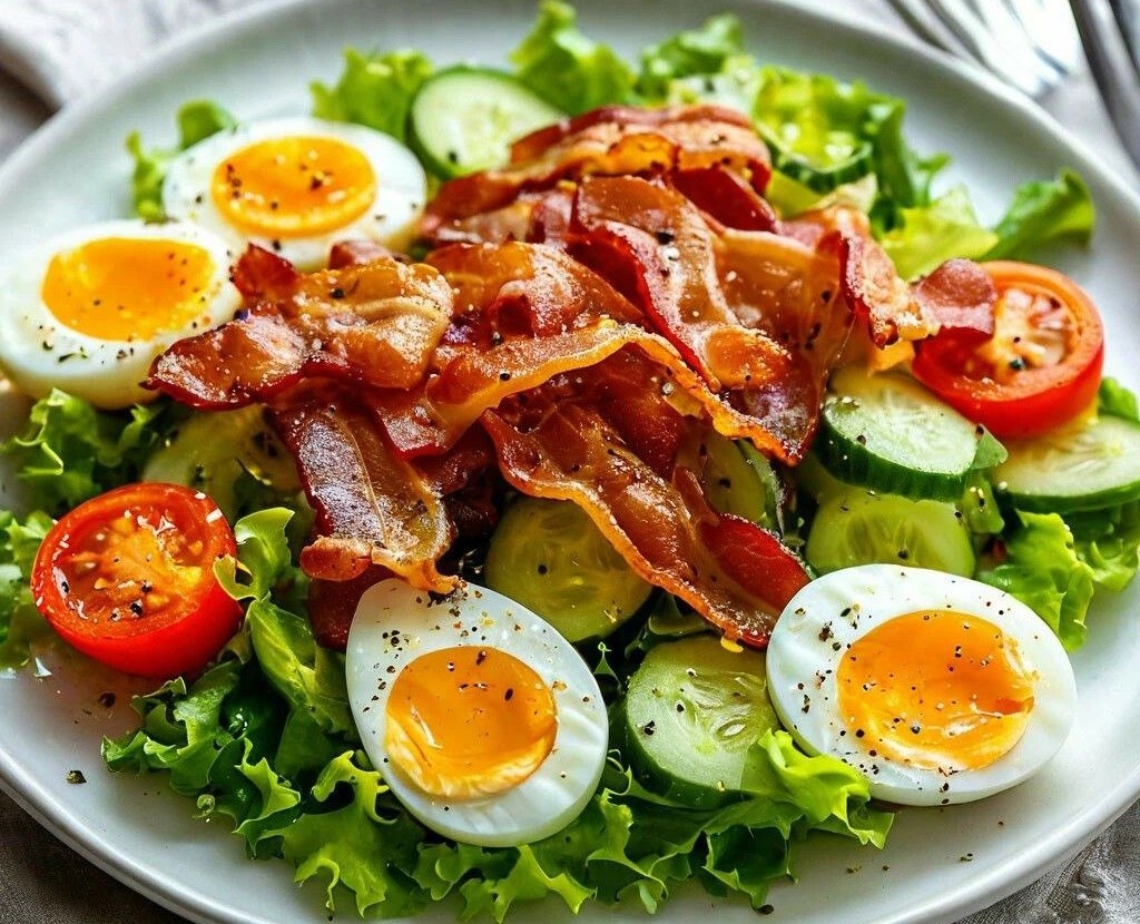 Этот салат сочетает в себе румяный жареный бекон, свежесть помидоров и огурцов, нежность варёных яиц и сочность зелёного салата. Он идеально подходит как для лёгкого обеда, так и в качестве гарнира к основным блюдам. Простота приготовления и баланс вкусов делают его отличным выбором для любого случая. Бекон — 200 г Помидоры — 2 шт. или черри – 12 шт. Яйца — 4 шт. или перепелиные – 8 шт. Листья салата (айсберг или ромэн) — 1/2 кочан Огурцы — 2 средних шт. Соль и перец — по вкусу Оливковое масло или ваш любимый соус для заправки — 3-4 ст. ложки Салат с жареным беконом готов. Приятного аппетита! Подписывайтесь на канал "Вкусно Очень" Данный рецепт на сайте👇