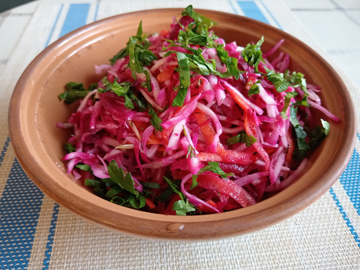 Хочу предложить вам приготовить замечательный свежий салат "по-грузински"! Это овощной салат, который сам по себе отдельное блюдо, и так же подходит как гарнир к любому мясу. За счёт того, что все овощи идут туда в сыром виде, получается необыкновенный насыщенный вкус. Что потребуется: Сначала разделаемся с капустой. Очищаем кочан от вялых и зелёных листьев, делим на четвертинки. Капусту надо тонко нашинковать. У меня есть для этого замечательный девайс: тёрка для овощей Бернер. Купила я её очень давно, лет 30, наверное, назад. Это оказалась самая верная моя помощница на кухне. Самая токая шинковка, нарезка картошки ломитками для жарки, лука кольцами, и кубиками.. Благодаря этой терке салат по - грузински становится не просто быстрым, а моментальным! Морковь и свёклу трём на крупной терке Овощи солим, добавляем сахар. Овощи мешаем только вилкой, слегка прижимая. Так сохраним свежий хруст. Мелко режем перец, чеснок, зелень. Добавляем к овощами, перемешиваем. Ну и самом конце доб