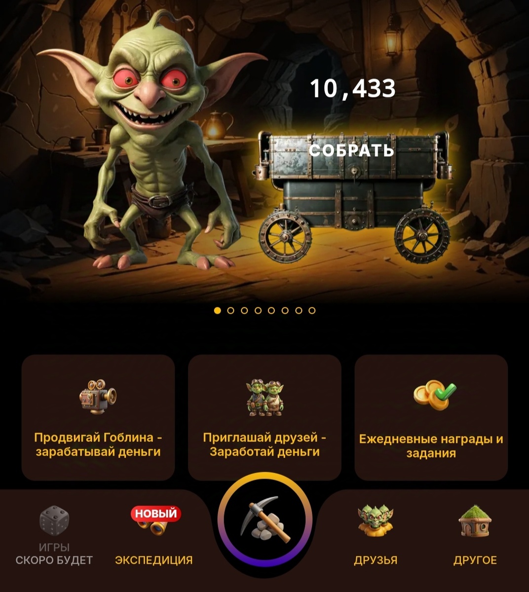 В Goblin Mine Game появились обновления. Во-первых, появилась вкладка Экспедиция. Она была и раньше, но являлась неактивной, а сейчас подсвечена красной надписью НОВЫЙ. Во вкладке предусмотрено несколько видов экспедиций: от Easy до Global Expedition. На первый взгляд это может показаться сложным, но на самом деле всё просто. Экспедиции рассчитаны на разную длительность – 1 час, 6, 12, 24, 48 и 72 часа. Если вы отправляете гоблина, к примеру, в 12-часовую экспедицию, то по прошествии этого времени, деньги, вложенные в неё умножаются на коэффициент. Смотрим: в этой экспедиции вероятность получить коэффициент 1 равняется 29 процентам, коэффициент 1,3 – 45 процентам, коэффициент 2 – 14 процентам и так далее. Таким образом получается, что самая выгодная экспедиция – это 72-часовая. Минимальный коэффициент в ней 1,5, а максимальный 100. Правда, вероятность малая – всего 0,1%. Но тем не менее, средства вложенные в неё окупятся в полтора раза. А вот самая невыгодная экспедиция – это часов