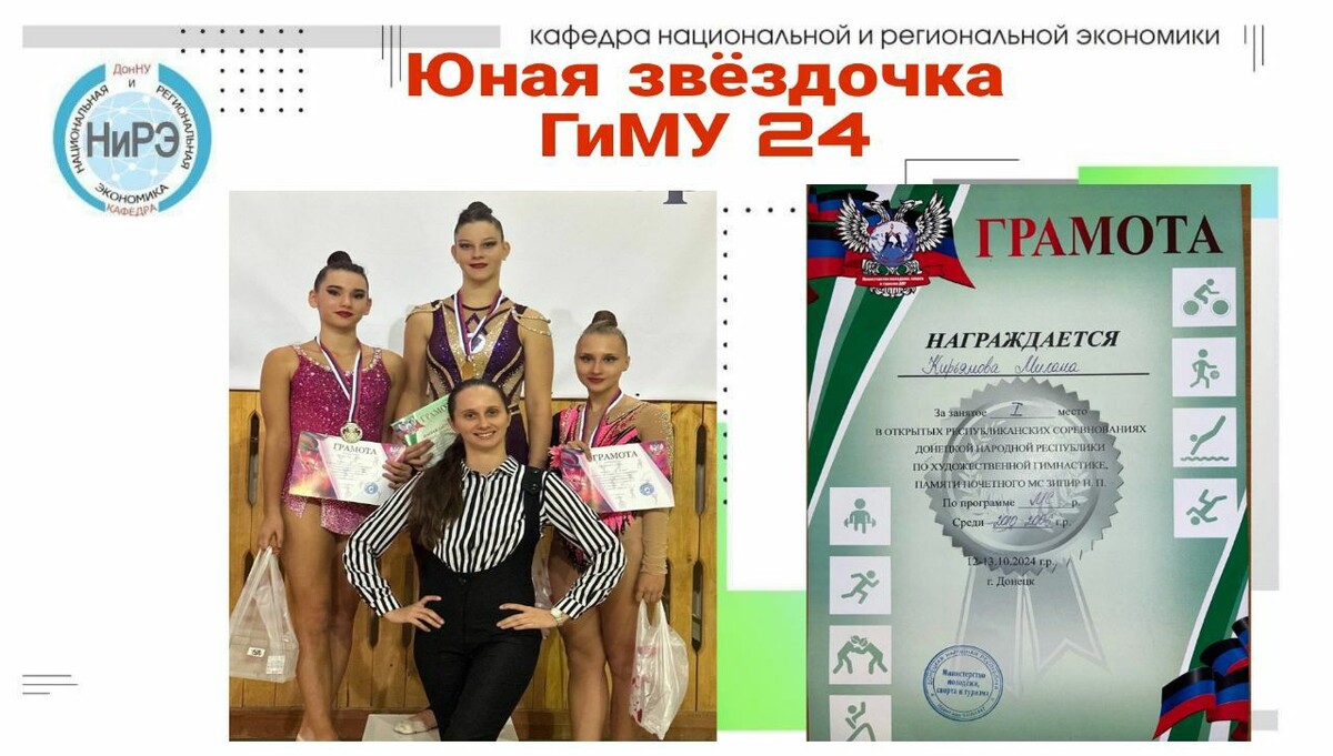 12-13 октября в Донецке проходили открытые Республиканские соревнования Донецкой Народной Республики по художественной гимнастике, памяти почётного мастера спорта Зипир Н.П. В соревнованиях участвовало более 200 спортсменок из Донецка, Макеевки, Шахтерска и Горловки. Студентка кафедры национальной и региональной экономики направления подготовки Государственное и муниципальное управление Кирьянова Милана стала победительницей соревнований и заняла 1 место по программе мастеров спорта. Поздравляем Милану с ее заслуженными спортивными результатами и желаем дальнейших побед.